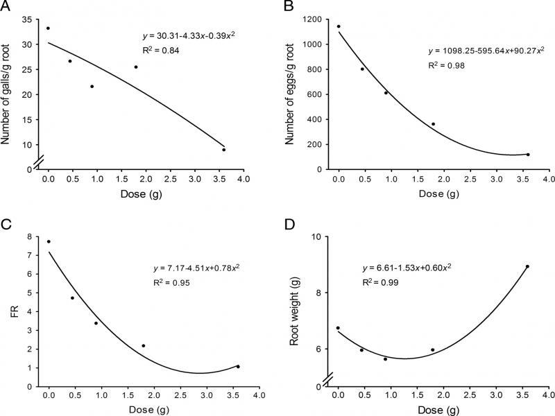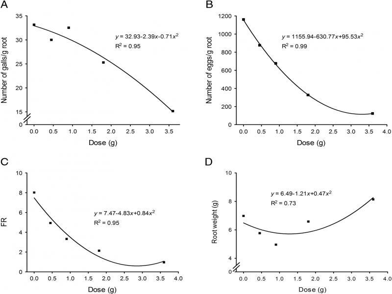 Biofumigation with Xanthosoma sagittifolium leaves macerates against Meloidogyne enterolobii. These experiments were done by incorporating X. sagittifolium leaves at different concentration (g/45 g) along with M. enterolobii eggs and planting tomato after three days of biofumigation. A: Number of galls. B: Number of eggs. C: Reproduction factor. D: Root weight. Experiment two. Quadratic polynomial regression models, p < 0.01.