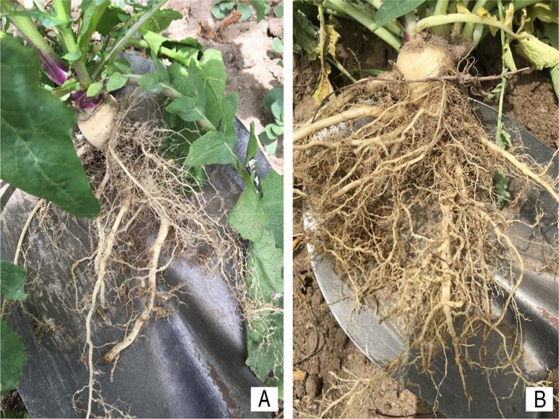 A and B: Roots of Brassica nigra (L.) W.D.J. Koch showing galls induced by Meloidogyne incognita (Kofoid and White, 1919; Chitwood, 1949).