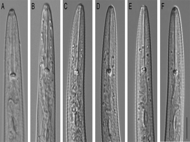 Anterior regions of Paratylenchus. A, B: P. projectus from samples collected in Devils Lake, Ramsey County, North Dakota; C-F: P. nanus from samples collected in Four Mile Run, Fall Church, Virginia. Scale – 10 µm.