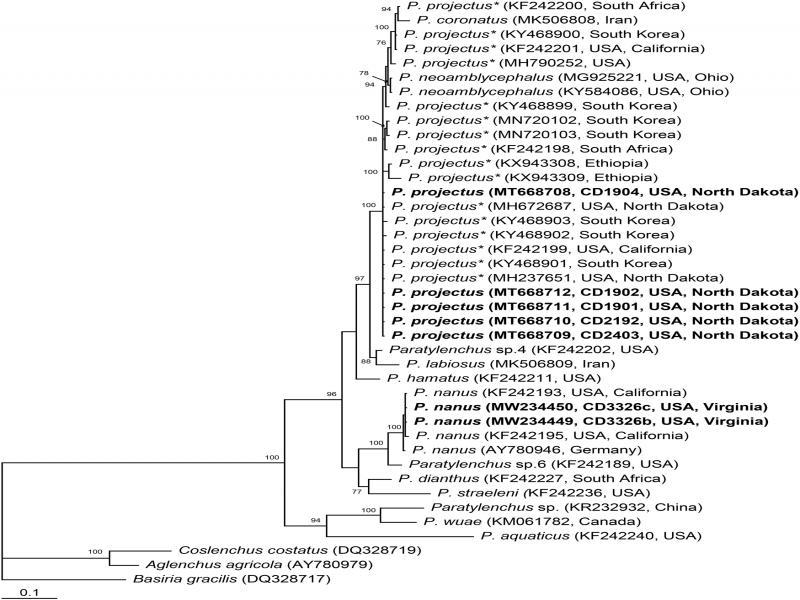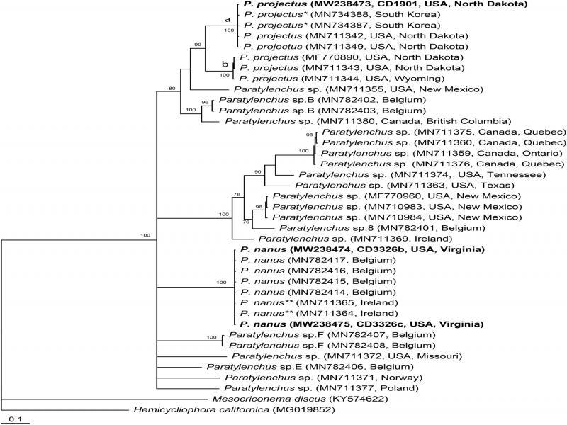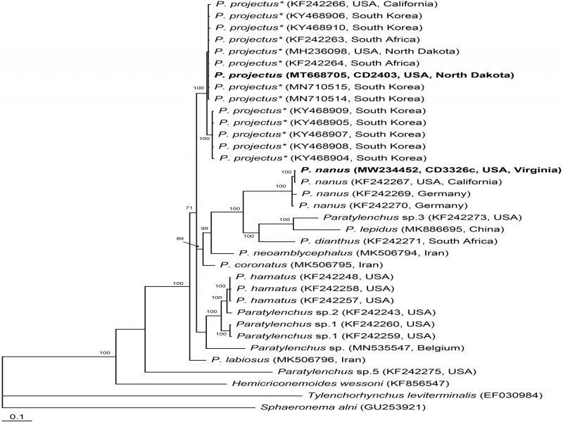 Phylogenetic relationships of Paratylenchus nanus with other related species. Bayesian 50% majority rule consensus tree from two runs as inferred from analysis of the D2-D3 of 28 S rRNA gene sequence alignment under the GTR + I + G model. Posterior probabilities equal or more than 70% are given for appropriate clades. New sequences are indicated in bold. * – originally identified as P. nanus.