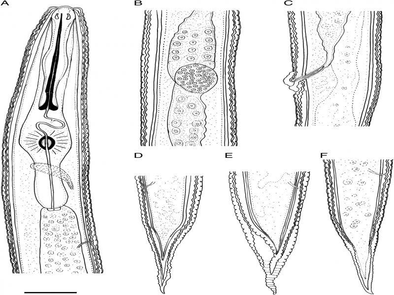 Cuticle annulation fine at midbody. Lateral fields marked by three longitudinal lines. Labial region distinctly trapezoid. Stylet and pharynx degenerated. Spicules semi-circular, tip slightly recurved. Gubernaculum linear, slightly thickened proximally. Bursa with crenate margin. Tail elongate, uniformly narrowing, annuli at distal end irregular.