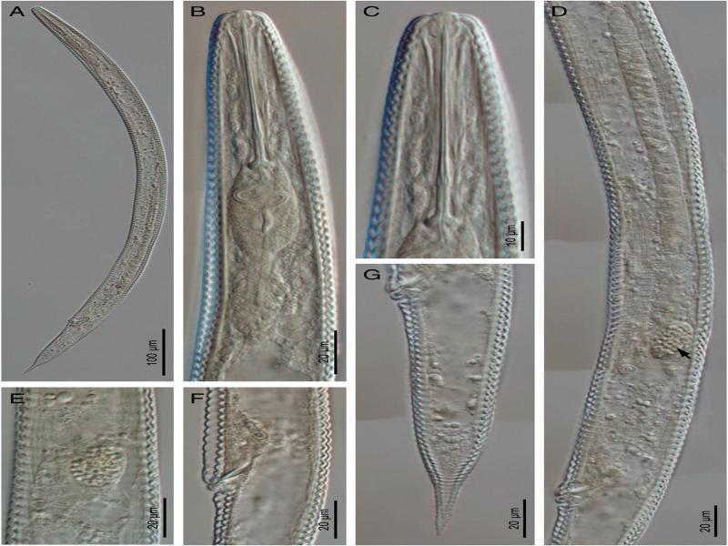 Light photomicrographs of Hemicycliophora ahvasiensis n. sp. Female. A: Entire body; B, C: Anterior body region; D: Reproductive system (the arrow indicates the spermatheca); E: Spermatheca; F: Vagina; G: Posterior body region.