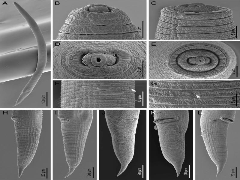 Scanning electron micrographs of Hemicycliophora ahvasiensis n. sp. Female. A: Entire body; B, C: Anterior end showing labial region; D, E: En face view of labial area; F, G: Annuli ornamentation (the arrows indicate the excretory pore); H–L: Posterior body region.