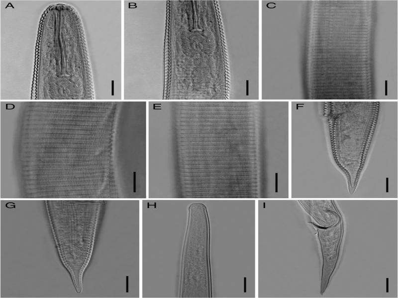 Light photomicrographs of Hemicycliophora conida Thorne, 1955 from Gilan province, Iran. A–G: Female. A: Anterior body region; B: Pharyngeal region; C: Lateral field at mid-body; D, E: Annuli ornamentation; F, G: Posterior body region; H, I: Male. H: Anterior body region; I: Posterior body region. (Scale bar = 20 μm).