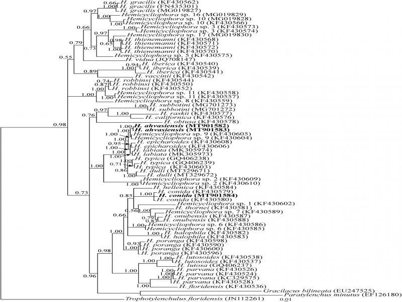 Bayesian 50% majority rule consensus tree inferred from analysis of the ITS rRNA gene of Hemicycliophora ahvasiensis n. sp. and Iranian population of H. conida under the GTR + G + I model. (lnL = 13525.0293; freqA = 0.2348; freqC = 0.2548; freqG = 0.2520; freqT = 0.2583; R(a) = 1.6876; R(b) = 2.3417; R(c) = 1.8416; R(d) = 0.8470; R(e) = 3.6304; R(f) = 1; Pinvar = 0.1024; Shape = 0.4967). Bayesian posterior probability values more than 0.50 are given for appropriate clades. New sequences are indicated in bold.
