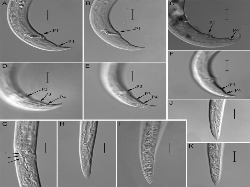 Bursaphelenchus yongensis paratypes (C, F) and a population from Beijing (A, B, D, E, G-K): A-F: Male tail by different focus show caudal papillae; G: Lateral view of female vulval regions show a three-celled structure; H-K: Female tail. (Scale bars = 10 μm)