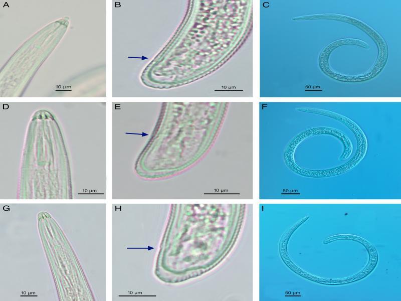 | Excretory pore to anterior end | 113.6 ± 5.1 (106–116) | 118.5 ± 1.7 (117–121) | 111.0 ± 6.2 (104–116) |
