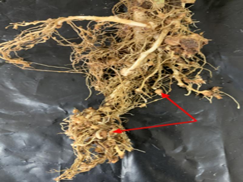 Roots of Gentiana macrophylla showing galls induced by Meloidogyne hapla (gall and egg mass, arrow).