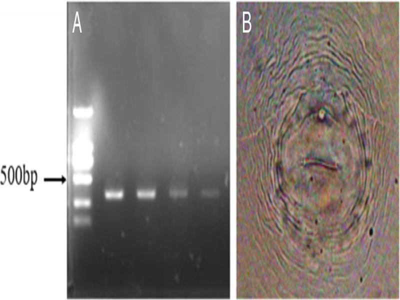 Molecular and morphological identification of Meloidogyne hapla. A: PCR amplification products of DNA extracted from Meloidogyne hapla using primer set JMV1/JMV hapla. B: Morphological observed on perineal pattern of female. Low range DNA ladder 2,000 bp.