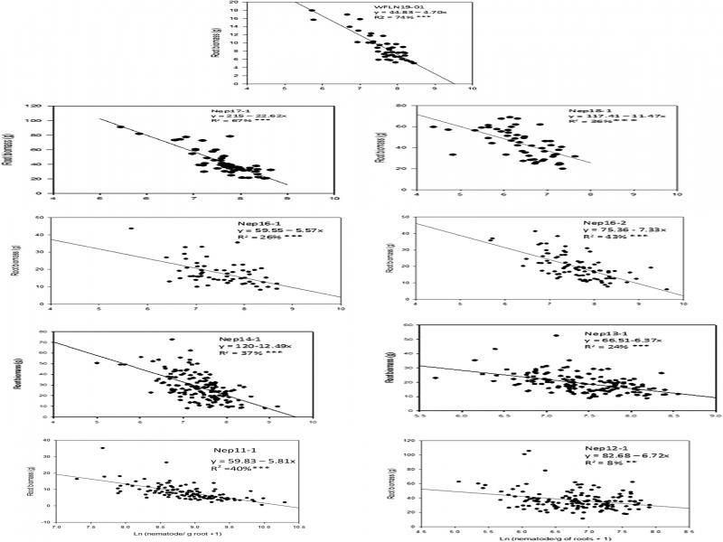 Regressions to show the relationship between root biomass and log (nematodes per g of roots) in nine nematode trials.