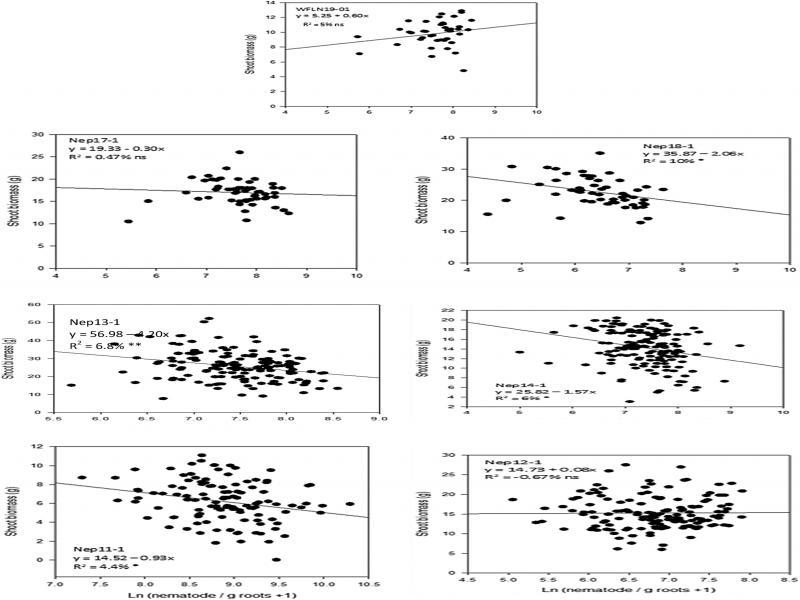 The CVs for shoot biomass varied considerably from 17% in WFLN19-01 trial to 34% in Nep11-1 trial (Table 3). Root biomass had the highest variability among the all parameters in each trial, ranged from 31 to 57%. Least CVs were observed in nematode/plant (~3–6%), followed by nematodes/g root.