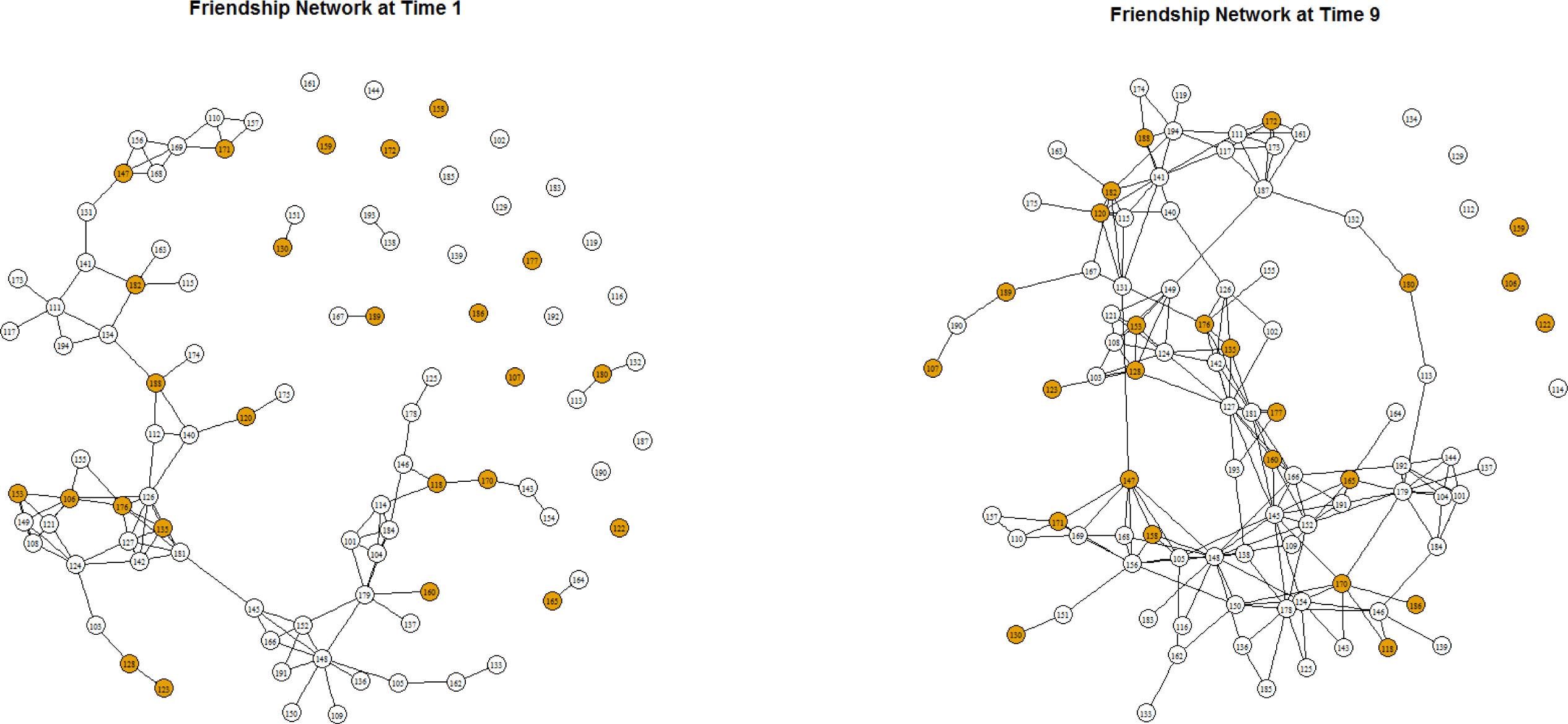 Sociograms of friendship networks at time 1 and 9