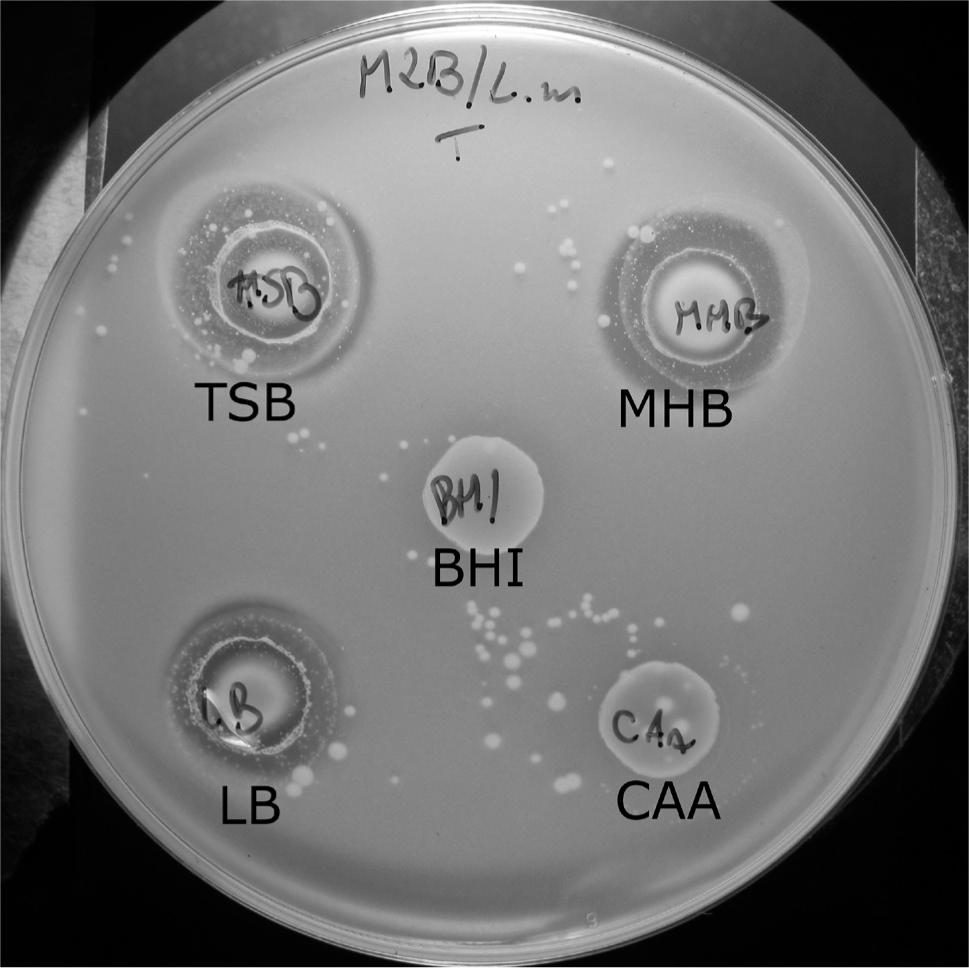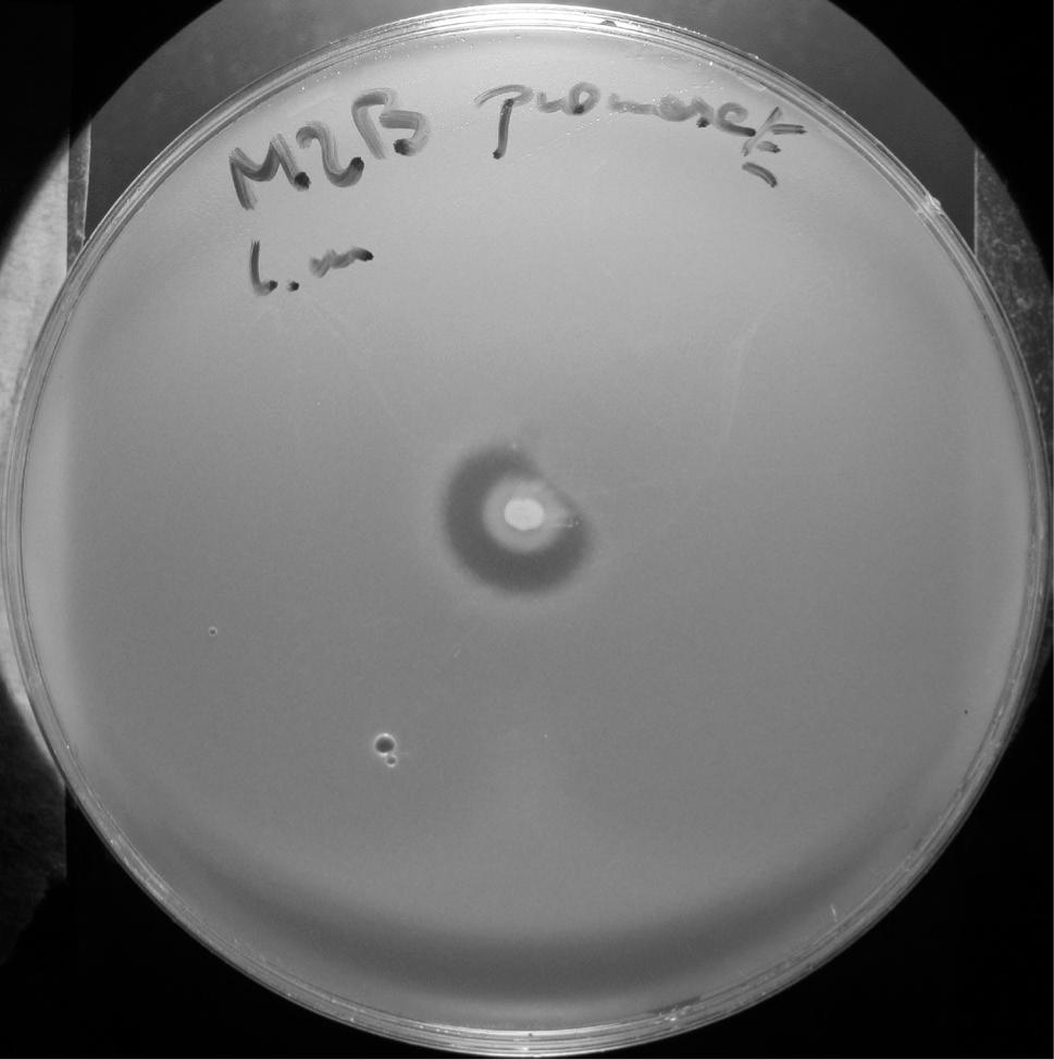Formation of “half moon zone” near the colony of producer strain M2B in the presence of proteolytic enzyme; an indicator strain – L. monocytogenes.