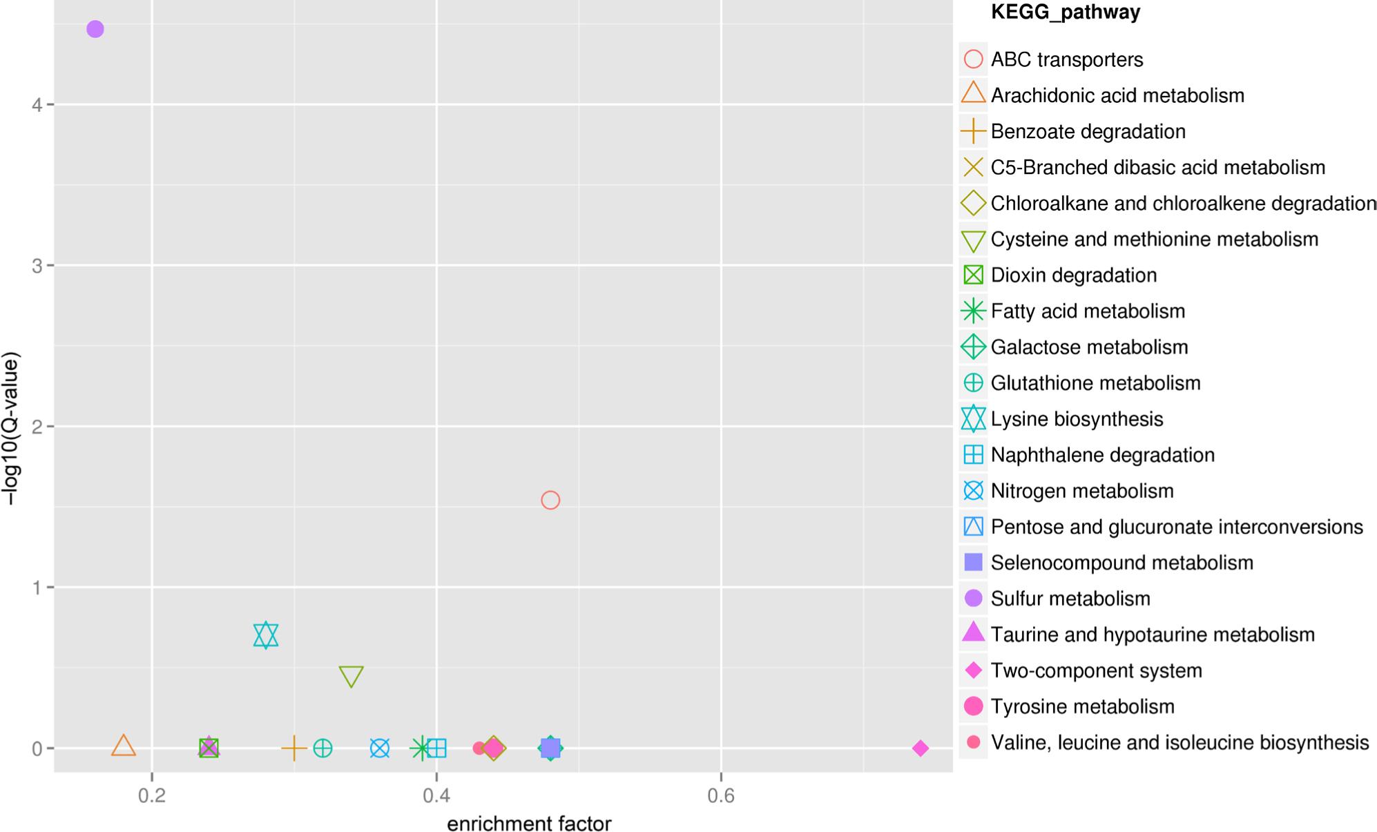 KEGG pathway scatter diagram of differentially expressed genes. Each pattern represents a KEGG pathway with its name listed in the right. X-coordinate represents the enrichment factor showing the ratio of all genes annotated in the pathway, in contrast to the differentially expressed genes annotated in the same pathway. The smaller the enrichment factor, the enrichment level of the differentially expressed genes was more significant in this pathway. Y-coordinate represents log10(Q_value). The higher the absolute Q_value, the enrichment level of the differentially expressed genes was more significant and reliable in this pathway.