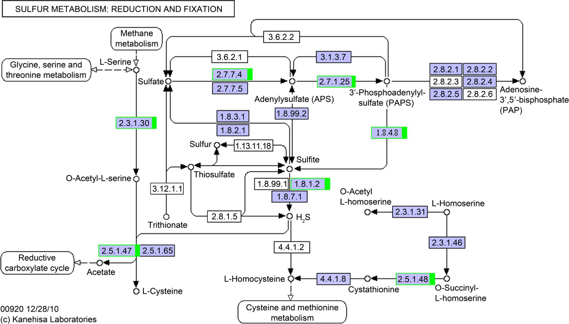 Distribution of the differentially expressed genes in a sulfur metabolism pathway. Compared to the control group, the enzyme marked by a green frame is related to a drown-regulated gene product. The number in the frame represents the enzyme code.