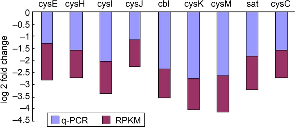 282 unigenes were differentially expressed under the screening criteria (fold change ≥ 2 and FDR < 0.01). Within these DEGs, 92 unigenes were significantly up-regulated and 190 unigenes were significantly down-regulated. The DEGs were searched against the KEGG database to identify their biological pathways. The 20 greatest enriched pathways were listed in Fig. 1. Pathways (represented by symbols) in the upper left quadrant of Fig. 1 contain DEGs with more significant and reliable enrichment levels, therefore the sulfur metabolism pathway ranked first. In sulfur metabolism pathway, there are nine DEGs which were all down-regulated significantly, corresponding to the encoded enzymes included serine acetyltransferase (CysE, EC 2.3.1.30), phosphoadenosine phosphosulfate reductase (CysH, EC 1.8.1.2), sulfite reductase (CysI and CysJ, EC 1.8.4.8), cystathionine beta-lyase (Cbl, EC 2.5.1.48), cysteine synthase (CysK and CysM, EC 2.5.1.47), sulfate adenylyl transferase (Sat, EC 2.7.7.4) and adenylylsulfate kinase (CysC, EC 2.7.1.25) (Fig. 2). These enzymes directly affect the content of sulfur metabolites such as cysteine (Cys), methionine (Met), glutathione (GSH), etc. RT-qPCR results further demonstrated that all nine genes showed similar expression patterns to those of RNA-seq, confirming the RNA-seq based transcriptome datasets were accurate and robust (Fig. 3).