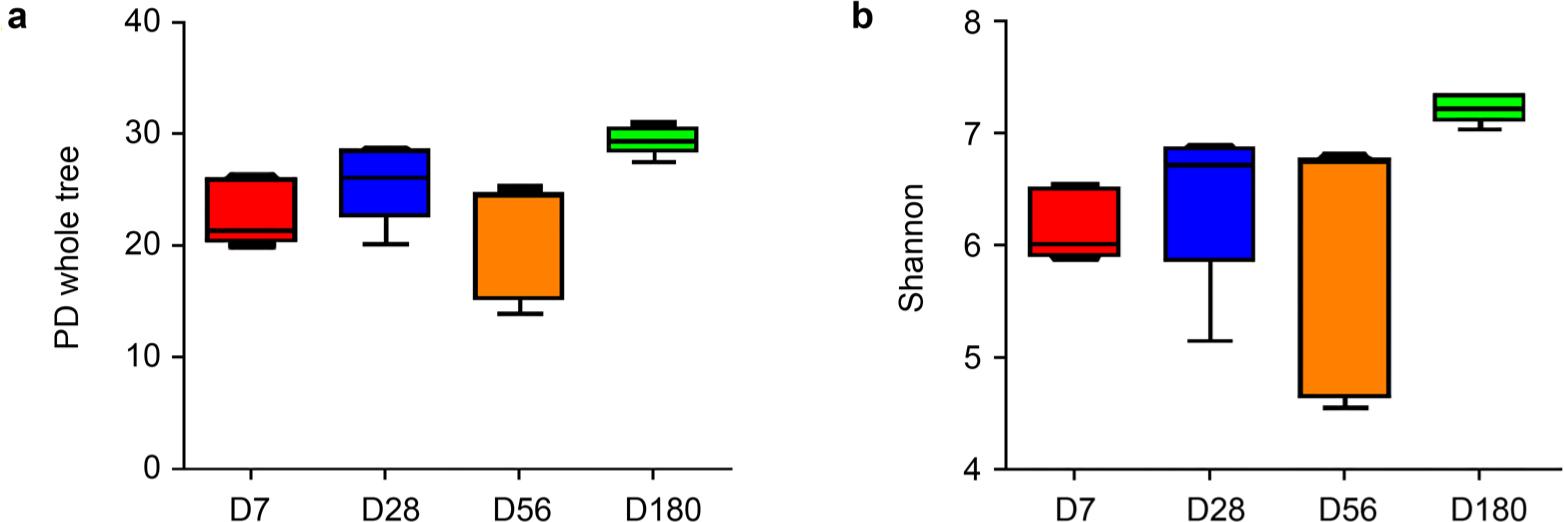 Alpha diversity comparisons among four age strata. Results of (a) the PD whole tree index and (b) the Shannon index evaluated by Kruskal-Wallis pairwise comparisons.