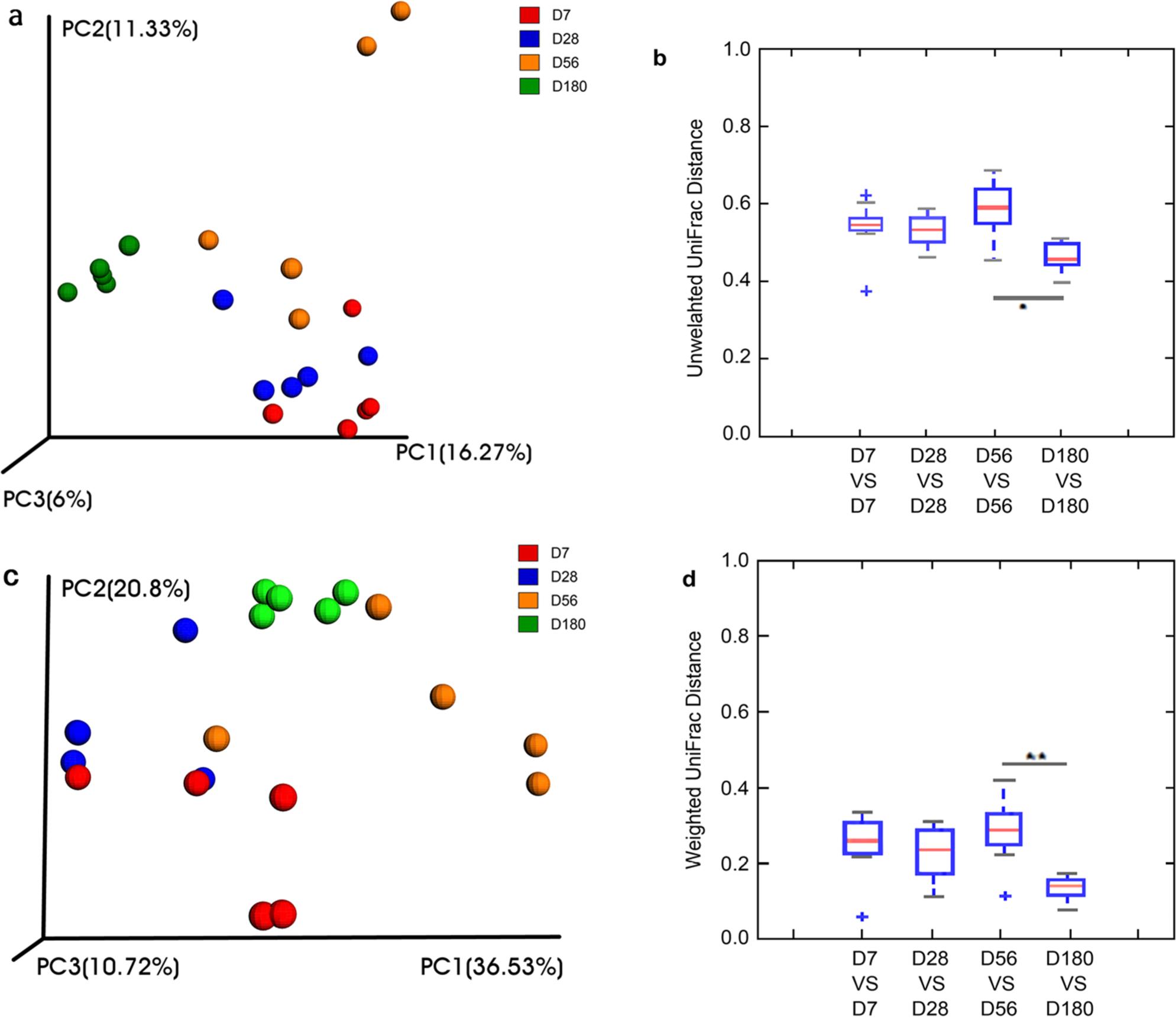 (a) PCoA results – calculated with unweighted UniFrac distances – depicting the diversity of gut microbiota among four age groups. (b) Comparisons of unweighted UniFrac distances within each age stratum. (c) PCoA findings – calculated with weighted UniFrac distances – showing the diversity of gut microbiota among 4 age strata. (d) Comparisons of weighted UniFrac distances within each age stratum (*p < 0.05, ** p < 0.01, Kruskal-Wallis pairwise comparisons).