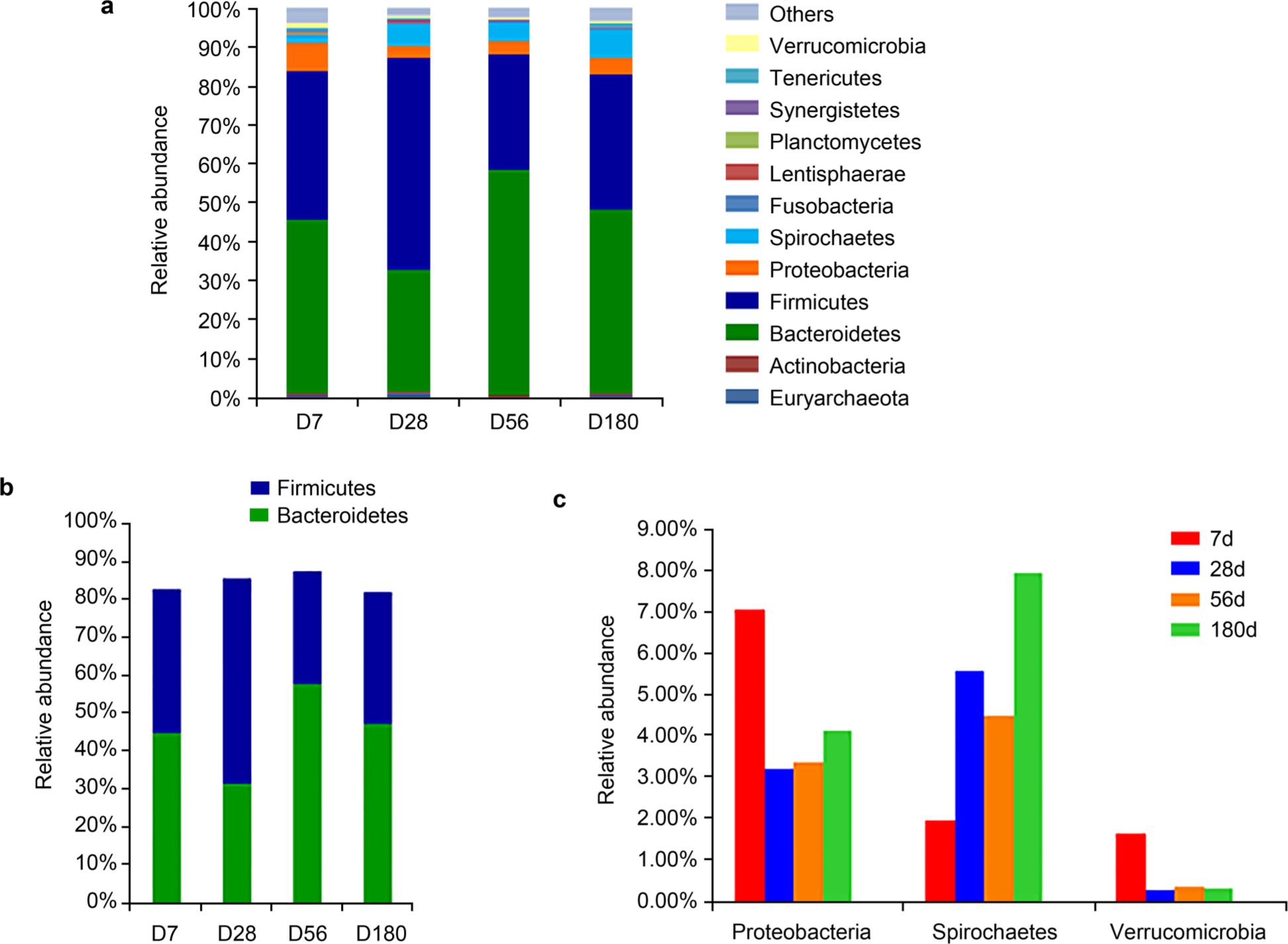 The average values of relative abundances of phyla within the five animals at each age group (a) phyla. (b) Firmicutes and Bacteroidetes. (c) Proteobacteria, Spirochaetes, and Verrucomicrobia.