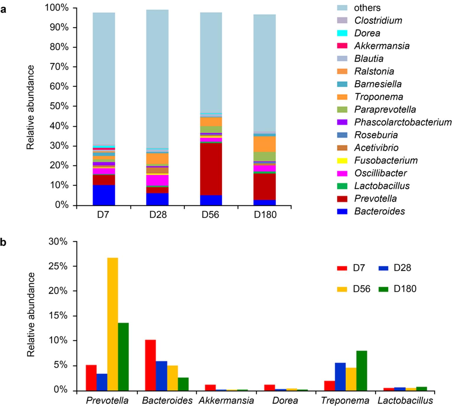 The average values of relative abundances of genus within the five animals at each age group (a) genus. (b) Prevotella, Bacteroides, Akkermansia, Dorea, Lactobacillus, and Treponema.