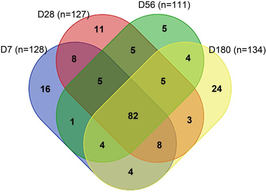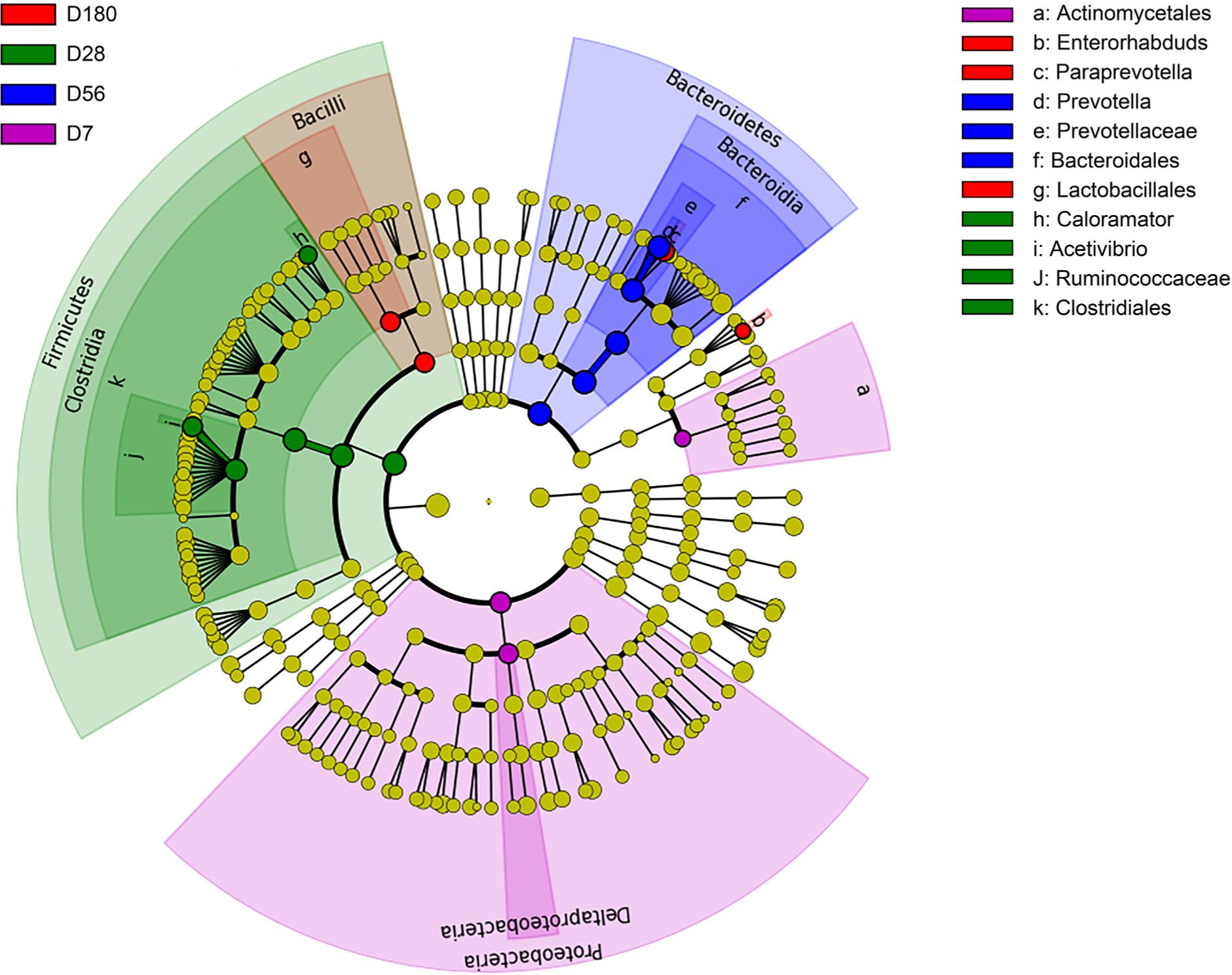 The most dominant bacterial genera populating minipig fecal samples were Bacteroides, Prevotella, Oscillibacter, Treponema, Paraprevotella, and Barnesiella. Bacteroides and Akkermansia were particularly varied in Tibetan minipigs among the four age groups, and the relative abundances of Bacteroides and Akkermansia decreased progressively with age (Fig. 4). The relative abundance of Dorea was greater in minipigs aged 7 days (1.10%) than in the other age groups (0.10%, 0.35% and 0.15% respectively). The relative fecal abundance of Prevotella was greater in minipigs aged 56 days (26.64%) than any other age (5.10%, 3.33% and 13.56% respectively). Compared with the other age categories, minipigs aged 180 days had the greatest relative abundance of Lactobacillus. Consistent with the observed trends in Spirochaetes abundance, Treponema abundance increased in Tibetan minipigs from 7 days (1.97%) to 180 days (7.96%) of age, with the exception of 56 days (5.57%) of age. As shown in Fig. 5, 82 genera were shared among Tibetan minipigs in the four age strata. Among the age groups, the fewest gut microbial genera were noted in 56-day-old Tibetan minipigs. Findings of microbial marker analyses indicated age-related differences in fecal bacterial of Tibetan minipigs (Fig. 6).