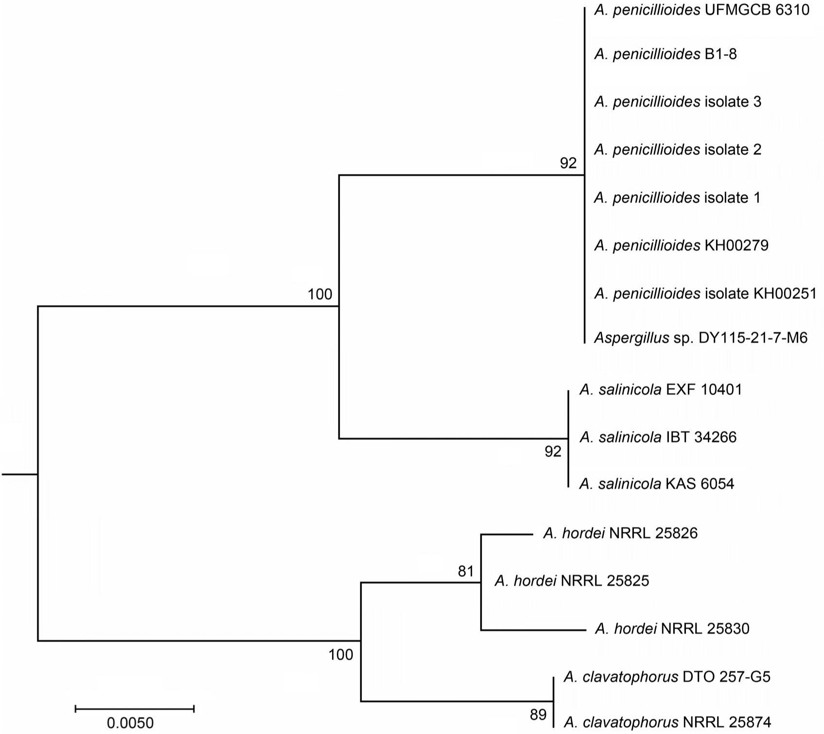 Phylogenetic tree of three native A. penicillioides isolates and the reference strains of Aspergillus spp. generated using the Maximum Likelihood method.