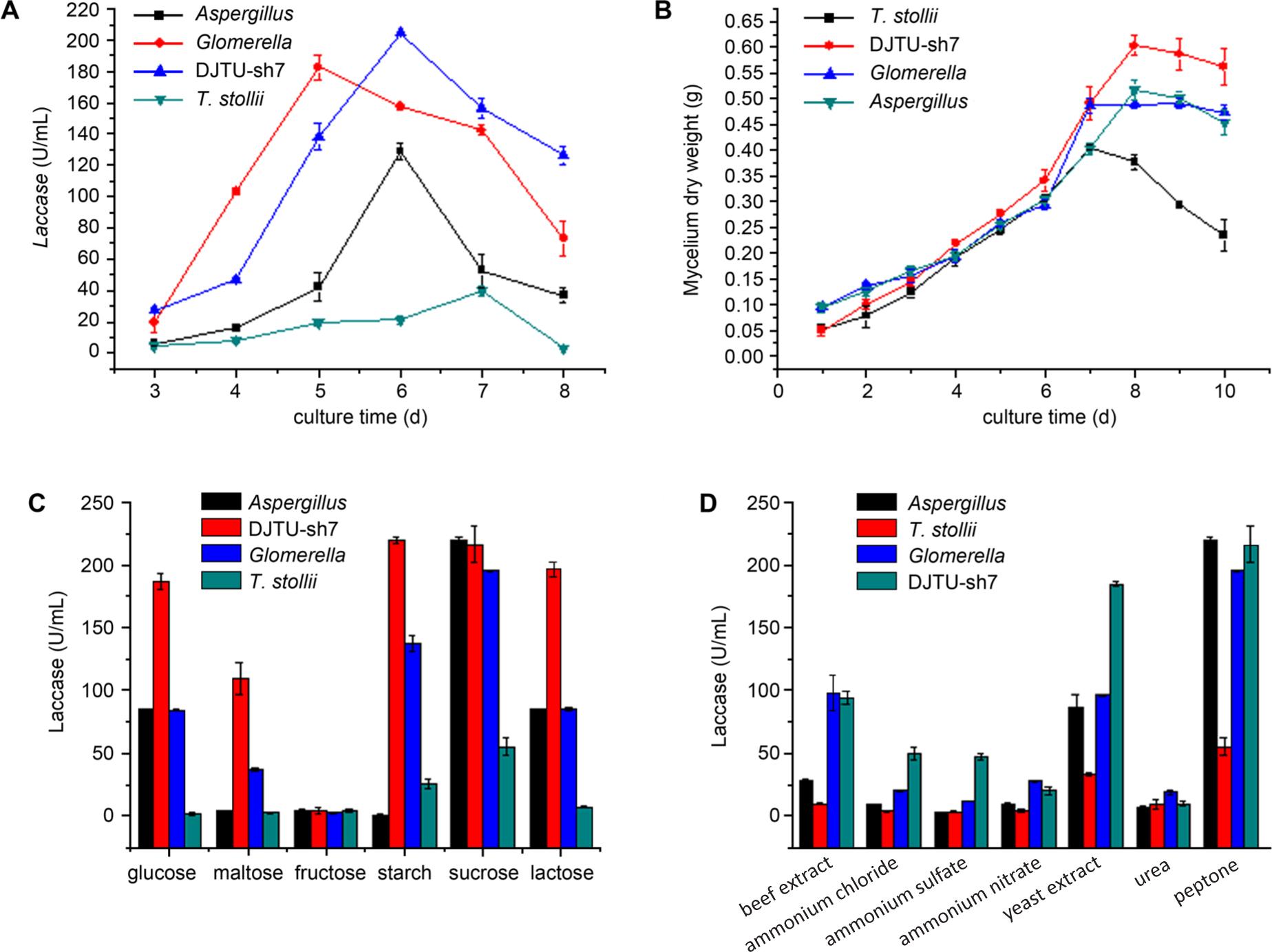 Fungal strains and single factor experiments. Three laccase-producing fungal strains were isolated from the enrichment culture (Hao et al. 2016), i.e., a Myrothecium verrucaria (Sordariomycetes, Ascomycota) strain DJTU-sh7 from MD, a Glomerella (Sordariomycetes) strain from ZS, and a Talaromyces stollii (Eurotiomycetes, Ascomycota) strain from NF. The time course of laccase production in DJTU-sh7 was compared with those of other three laccase-producing fungi (Fig. 1). At the beginning, the mycelia grew slowly, and mycelial pellets were small with the low laccase activity in all strains. Then the mycelia grew fast and mycelial pellets became more compact and larger, while the fermentation media were clear and sticky. DJTU-sh7 displayed the highest laccase activity on day 6 (Fig. 1A), followed by the Glomerella strain on day 5, the Aspergillus strain (isolated from Cordyceps sinensis rhizosphere, unpublished) on day 6, and the T. stollii strain on day 7. The maximal mycelia dry weight came two days later than the laccase peak in DJTU-sh7 (Fig. 1B).