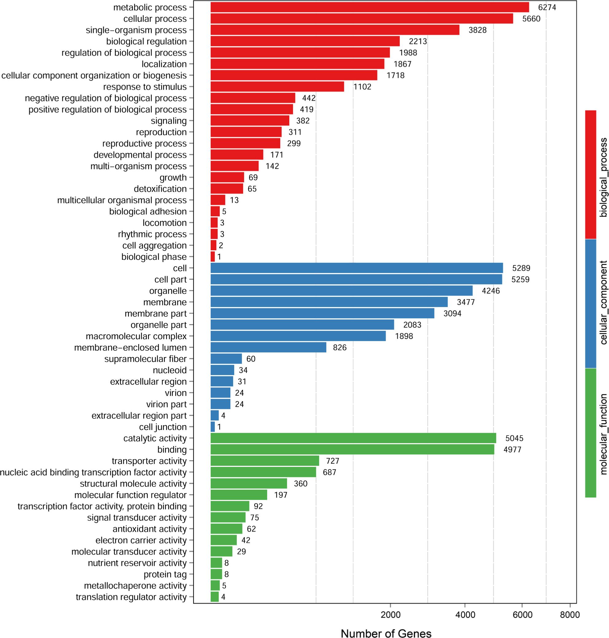 The functional annotations were performed by the alignments with NCBI Nt, NR, SwissProt, KOG and KEGG databases using Blast N (Nt) or Blast X/Diamond (the rest) (Buchfink et al. 2015). BLAST2GO (default parameters; http://www.blast2go.com/) and the GO database (http://www.geneontology.org) were used for the functional annotation of biological process, molecular function and cellular component. InterProScan 5 (http://www.ebi.ac.uk/interpro/search/sequence-search) was used for the InterPro annotation. Trinity and Transdecoder (https://help.rc.ufl.edu/doc/TransDecoder) were used to predict the open reading frame (ORF) and protein-coding sequence (CDS).