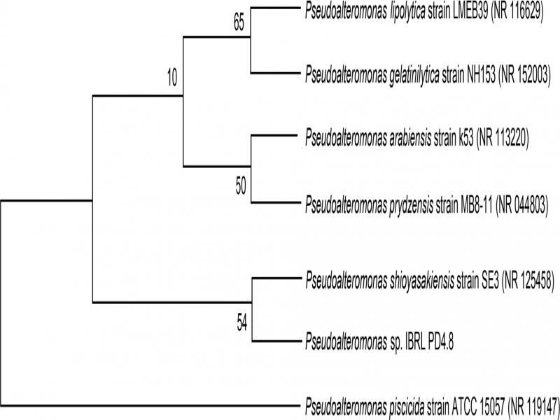 Phylogenetic tree of Pseudoalteromonas sp. IBRL PD4.8 isolated from the surface of C. racemosa.