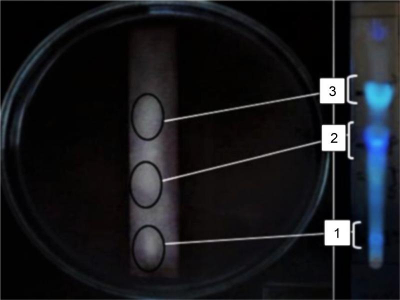 Circle (1) light yellow, Rf 0.06; (2) fluorescent blue, Rf 0.35; (3) fluorescent green, Rf 0.55.