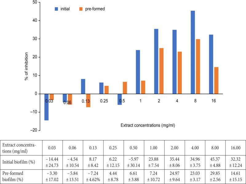 Although inhibitory activity of the extract against the pre-formed biofilm was less effective in comparison with the initial biofilm, their inhibition patterns were comparable (Fig. 3). The pre-formed biofilm production was induced at lower extract concentrations of 0.03 mg/ml (– 3.30 ± 17.02%), 0.06 mg/ml (– 5.84 ± 13.51%), and 0.13 mg/ml (– 7.24 ± 4.62%). Furthermore, gradual increments in the antibiofilm activity were also observed when the extract concentrations increased from 0.25 mg/ml (4.44 ± 8.78%) to 0.50 mg/ml (6.61 ± 3.88%) and 1.0 mg/ml (7.24 ± 10.72%), accordingly. Additionally, the highest inhibition of the pre-formed biofilm was detected at 8.0 mg/ml (29.85 ± 2.56%), but it was statistically not significant (p > 0.005).