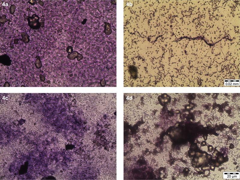 LM study. Hypothetically, the coloration of the purple image observed under LM arised from a positively charged CV stain that bounded to the envelopes of negatively charged cells and biofilm matrix. The LM results in Fig. 4 indicated that the extract was capable of inhibiting the initial and pre-formed biofilm of V. alginolyticus FB3 at 8.0 mg/ml. Meanwhile, Fig. 4a and 4c depicted the untreated sets of the initial and pre-formed biofilms, respectively. The deep purple colors from both figures were suggestive of highly dense biofilms that consisted of extracellular polymeric substances (EPS) matrix that entrapped the microcolonies. In the initial biofilm set, its exposure to the extract resulted in complete eradication of the biofilm, which left unbound cells and thin strands of damaged biofilms only (Fig. 4b). However, these results also showed that the pre-formed biofilm was less disrupted when treated with the extract at 8.0 mg/ml (Fig. 4). Some small dark patches of biofilms, in particular, have been seen to crumple together into a denser form.