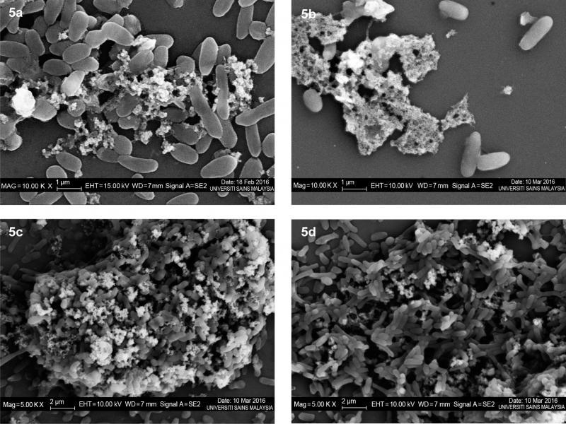 SEM study. The SEM observations have revealed significant destructive effects on both initial and pre-formed biofilm architectures when treated with an extract at a concentration of 8.0 mg/ml (Fig. 5). The untreated initial biofilm shown the very low density of EPS within microcolonies that aggregated together (Fig. 5a). In contrast, the untreated pre-formed biofilm displayed more copious and non-homogenized production of EPS and microcolonies (Fig. 5c). The multilayer biofilms entrapped the microcolonies in a more complex arrangement. Moreover, the treated initial biofilm revealed that both microcolonies and EPS components alike were adversely destroyed and clumped together into unrecognized shape (Fig. 5b). Meanwhile, the treated pre-formed biofilm indicated drastic reductions with partially vanished EPS components that served to protect the cells, thereby contributing to a less compact structure (Fig. 5d).