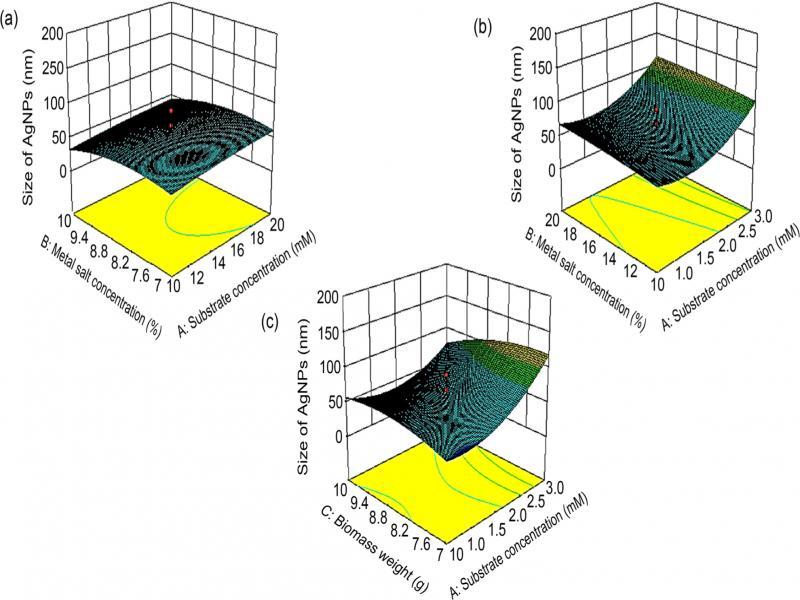 It clarifies that the size of the AgNPs had increased by increasing substrate concentration (mM) while the increase in metal salt concentration would lead to the decreased size of AgNPs. The graphs (Fig. 4C) depicted the negligible interaction between metal salt concentration and weight of biomass. The increase in salt concentration caused a slight increase in the size of particles but maximum salt concentration would have resulted in smaller AgNPs. The plots further illustrated the relationship between substrate concentration and wet biomass weight. Decreased size of AgNPs was observed at minimum substrate concentration and wet biomass weight. The results corroborated the hypothesis i.e., the decreased size of AgNPs.
