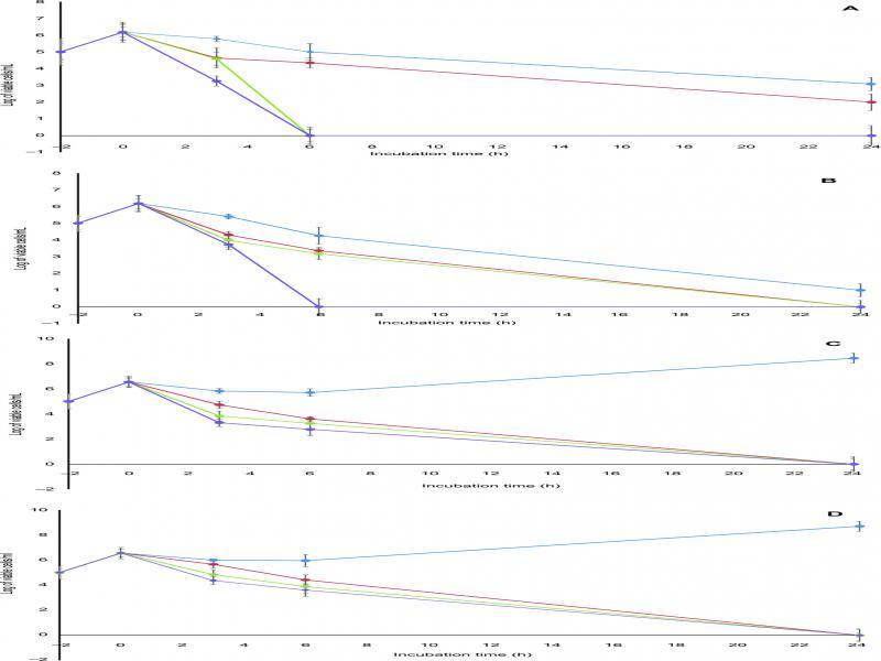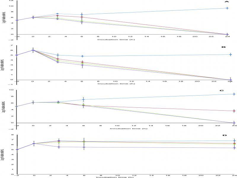 Bactericidal activities of (A) zabofloxacin, (B) moxifloxacin, (C) levofloxacin and (D) ciprofloxacin against fluoroquinolone-sensitive MRSA clinical isolate S15. Blue line, 0.5 MIC; red line, 1 MIC; green line, 2 MIC; purple line, 4 MIC. Data points are geometric means with error bars being one standard deviation of replicate experiments (n = 3).