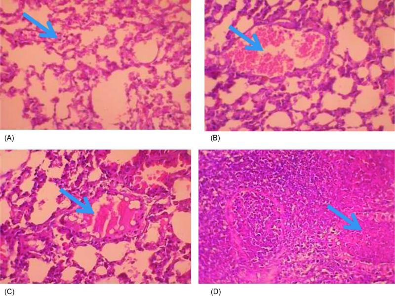 Lung tissue sections dissected from mice infected with MRSA clinical isolate and treated with (A) zabofloxacin showing very mild congestion (arrow) and inflammation with scarce inflammatory cells in the interstitial spaces; (B) moxifloxacin showing moderate congestion with ectatic vessels (arrow) and moderate interstitial inflammation; (C) levofloxacin showing moderate inflammation, congestion and oedema, with a dilated lymphatic vessel (arrow); and (D) ciprofloxacin showing bronchopneumonic changes with marked congestion, oedema, inflammatory infiltration and necrosis, with accumulation of necro-inflammatory exudate within the lumen of bronchioles (arrow) (H&E x400).