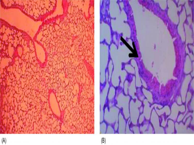 (A, × 100) cross section of lung tissue dissected from mice treated with zabofloxacin showing patent alveoli, (B, × 400) clear alveolar spaces and normal vessels, the bronchioles are lined by a layer of pneumocytes (arrow).