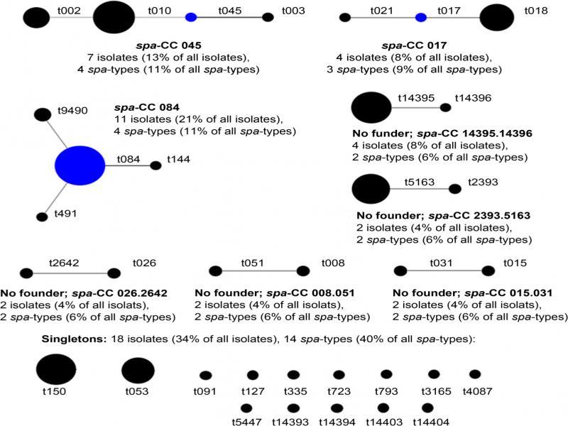 The results of BURP analysis. The 20 spa types were assigned to proper clonal complexes. Eighteen singletons were found among the 53 strains analyzed. Black circles represent the spa types assigned to the proper clonal complexes, and the blue circles represent the ancestor within the clonal complex.