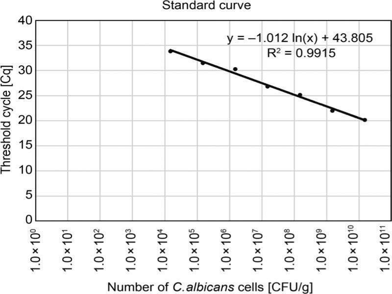 Quantitative real-time PCR (qPCR).Candida spp. in the fecal samples were quantified by qPCR, as described by Gosiewski et al. (2014). To detect specific DNA sequences, ready-to-use JumpStart TaqReadyMix (Sigma-Aldrich, Poznań, Poland) kit, fluorescently FAM dye labelled probe (FAM-5’-TTAACCTAC-TAAATAGTGCTGCTAGC-3’-BHQ1) and pairs of specific primers (Genomed, Warszawa, Poland): (F) 5’-TTGGTGGAGTGATTTGTCTGCT-3; (R) 5’-TCTAAGGGCATCACAGACCTG-3’ (Genomed) for Candida were used (Sugita et al. 2012). A standard curve was prepared. DNA from the given numbers of C. albicans ATCC10231 was added in serial dilutions from 101 to 107 cells (in a volume of 1 ml saline ∼ 1 g) to a series of qPCRs. The reactions were carried out in a CFX96 thermocycler (BioRad, California, USA). A standard curve from these data is shown in Fig. 1. Detection and quantitation were linear over the range of the DNA concentrations examined. To determine the number of Candida cells, the fluorescent signals detected from DNA of stool samples (in duplicate) in the linear range of the assay were averaged and compared to the standard curve.