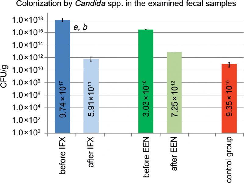 The total distribution of Candida in the large intestine contents before treatment with both IFX and EEN as well as in the control group differed significantly (p = 0.01). The total fungal distribution after treatment in the three groups was statistically insignificant (p = 0.39).