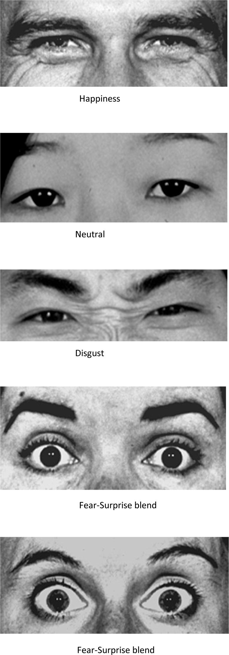 We evaluated participants’ ER skills with the eye-submodule of the FEFA (58), which contains 40 black and white photos of various eye-regions, belonging to people from different cultures. Each FEFA eye-submodule photo is shown separately on a computer screen with all six different lexically labeled response options. In addition to lexical choices, researchers in both countries also read response options to participants. The FEFA eye-submodule contains six photos of happiness, eight photos of neutral expressions, four of surprise, three of disgust, four of sadness, six of anger, and nine of blended emotions, which are blended so that they can be labeled correctly with two different emotions. Of the nine blended emotions, five are blended similarly between fear and surprise, and the other four as follows: happiness-surprise, happiness-neutral, sadness-neutral, and anger-disgust. Each answer is scored 0 = incorrect and 1 = correct (in blended emotions, there are two possible correct answers) (58). We reported the sum score for the FEFA total scale (i.e., sum of correct answers of all 40 photos), sum scores for each basic emotion scale separately (i.e., happiness, neutral, surprise, disgust, sadness, and anger), sum score for the blended emotions scale, sum score for the fear-surprise blended emotion scale, error pattern (i.e., frequency of different incorrect responses) of participants’ responses to different basic emotion scales, and at last, we reported how participants labeled five fear-surprise blended emotions, because we wanted to see which was the easier emotion to interpret, fear or surprise. Examples of FEFA eye-region photos are shown in Figure 1.