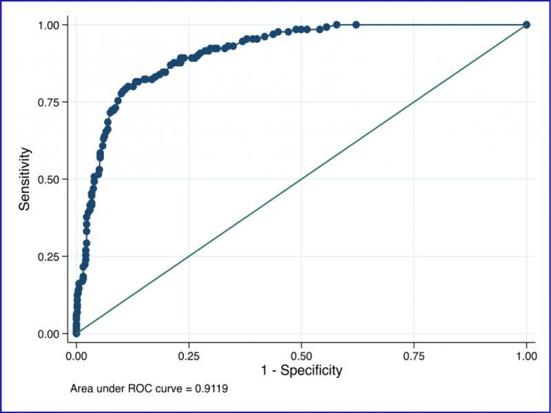 We found similar findings in our sensitivity analysis using the restricted sample as we did in the full sample. In the combined sample there were 87 subjects (17%) who had BP-I disorder. There was no significant difference (p = 0.06) in mean age between subjects with BP-I disorder (10.3 ± 3.5 years) and those without BP-I disorder (11.0 ± 3.2 years). The ROC analysis of the CBCL-BP profile yielded an AUC of 0.93. A t-score of ≥ 195 on the CBCL-BP profile was the best cut-off score and correctly classified 87% of subjects with BP-I disorder with 86% sensitivity, 87% specificity, 58% PPV and 97% NPV.