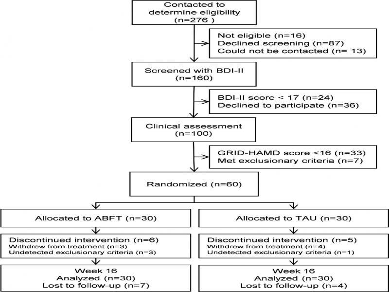 In Figure 1 “Allocated to ABFT” was printed as N=29, but is corrected to N=30. “Discontinued intervention” in the ABFT arm was printed as N=5 (3 withdrew from treatment, 2 undetected exclusionary criteria), but is corrected to N=6 (3 withdrew from treatment, 3 undetected exclusionary criteria). “Lost to followup” in the ABFT arm was printed as N=6 but is corrected to N=7. “Lost to followup” in the TAU arm was printed as N=2, but is corrected to N=4.