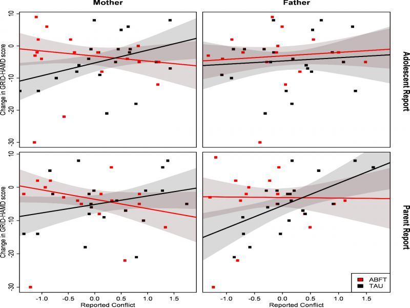 The two figures in the original version of the paper Moderation of treatment effects by parent-adolescent conflict in a randomised controlled trial of Attachment Based Family Therapy for adolescent depression unfortunately contained some errors.