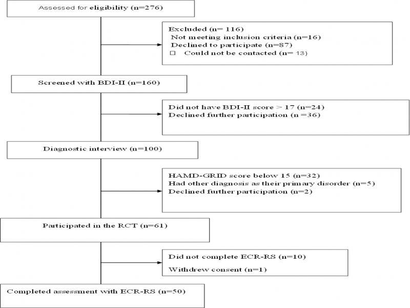 Data for this study came from a randomized controlled trial (RCT) of adolescents with depression conducted at two Child and Adolescent Mental Health Service clinics in the county of Akershus, Norway. From October 2013 to January 2016, a total of 276 adolescents were screened for inclusion in the study. Progression through the assessment process is summarized in Figure 1. Participants were required to be currently living with an adult who had been one of their primary caregivers since before age four (to make sure participants had an early attachment relationship with their primary caregiver). Clinically referred adolescents (13-17 years old) and their parents were eligible to participate in the study if: 1) depression was listed as a reason for referral or 2) adolescents had been referred for reasons other than depression, but the adolescent scored > 6 on the Affective Problems subscale of the Youth Self Report form(41) at intake. Next, participants were assessed with Beck Depression Inventory-II (BDI-II) (42), those who scored > 17 went on to complete the full assessment which included a diagnostic interview. Adolescents meeting the DSM-IV-TR criteria for a current major depressive episode (43) and with a baseline score of 15 or above on clinician-rated Grid Hamilton Depression Rating scale (44), were included in the trial. Clinician-rated and self-reported measures of depression were both included in the screening, to get a clinical confirmation of the self-reported depressive symptoms. Adolescents meeting DSM-IV-TR criteria for any psychotic disorder, anorexia nervosa, bipolar disorder, intellectual disability or pervasive developmental disorders were excluded from the study. Eligible adolescents and parents provided written, informed consent and were then randomized to either Attachment Based Family Therapy (ABFT) or treatment as usual (TAU). The RCT study sample consisted of 61 adolescents (45). One patient withdrew consent shortly after randomization, 10 patients did not complete the Experiences in Close Relationships - Relationships Structure questionnaire (ECR-RS)(46). The current sample consisted of 50 adolescents, with a mean age of 15 years (SD = 1.3), 84% (N=42) of participants were girls. The project was approved by the Regional Committee for Medical Research Ethics.