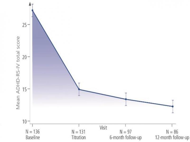 Statistically significant improvements (p < .001) were observed for both ADHD-RS-IV subscale scores at all assessed time-points. The mean change from V1 in hyperactivity/impulsivity scores was -5.1 (95% CI: -6.0 to -4.2) at titration, -5.0 (95% CI: -6.3 to -3.8) at V2 and -5.7 (95% CI: -6.9 to -4.4) at V3. The mean change from V1 in inattention scores was -6.7 (95% CI: -7.6 to -5.8) at titration, -6.8 (95% CI: -7.9 to -5.7) at V2 and -7.1 (95% CI: -8.3 to -5.8) at V3 (Table 3).