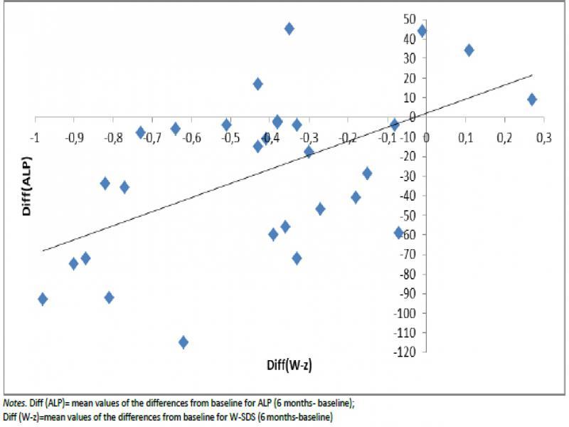 Baseline values of weight z-score, glucose, creatinine, ALP, and 25OH-Vit D were subtracted from 6 months values to calculate the differences they created (Diff(variable)). Then, whether an association of weight z-score change at 6 months with the changes from baseline in biochemical variables was calculated. A moderate positive correlation was found between ALP difference (Diff(ALP)) and weight z-score difference (Diff(W-z)) at 6 months on Spearman’s rank-order correlation (r=0.47, p=0.009) (see Figure 1). No association was seen between Diff(W-z) and Diff(glucose) (r=-0.03, p=0.844), Diff(creatinine) (r=0.27, p=0.133) or Diff(25OH-it D) (r=0.29, p=0.121), respectively.