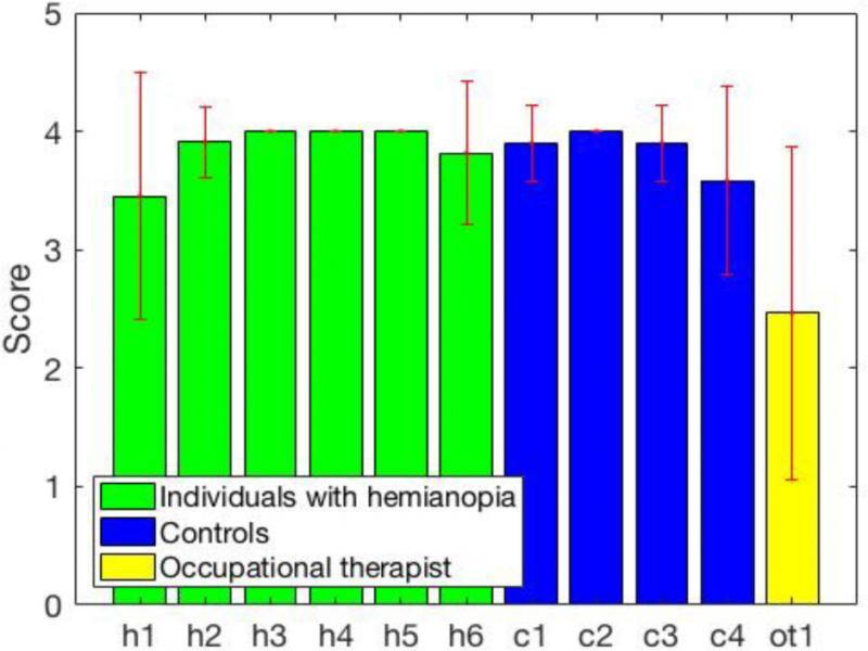 Average score given to the virtual hallway scenario by individuals with hemianopia, normal sighted controls and the occupational therapist. The error bars represent the standard deviation.