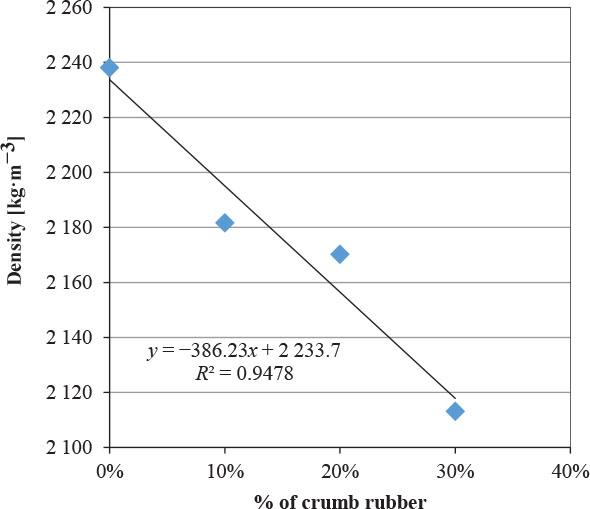 The decreasing trend reflects the lower density of crumb rubber in comparison to natural aggregates leading to a progressively lighter concrete as the percentage of crumb rubber increased.