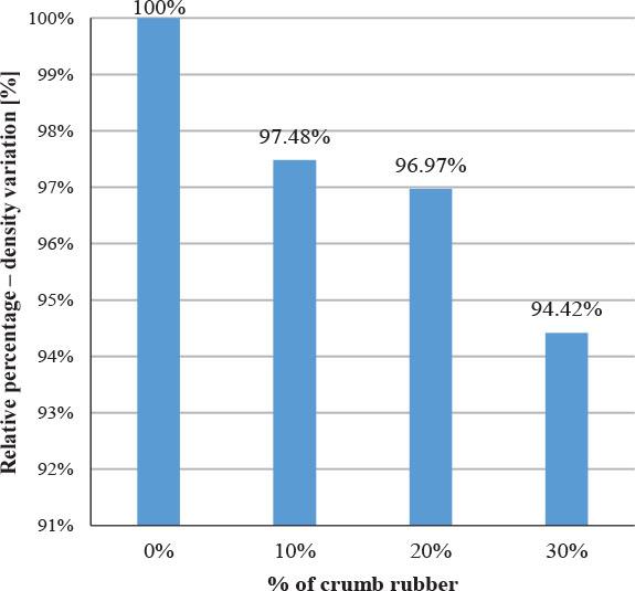 Density tends to decrease slightly as the percentage of crumb rubber increases, which can be beneficial for lightweight construction applications.